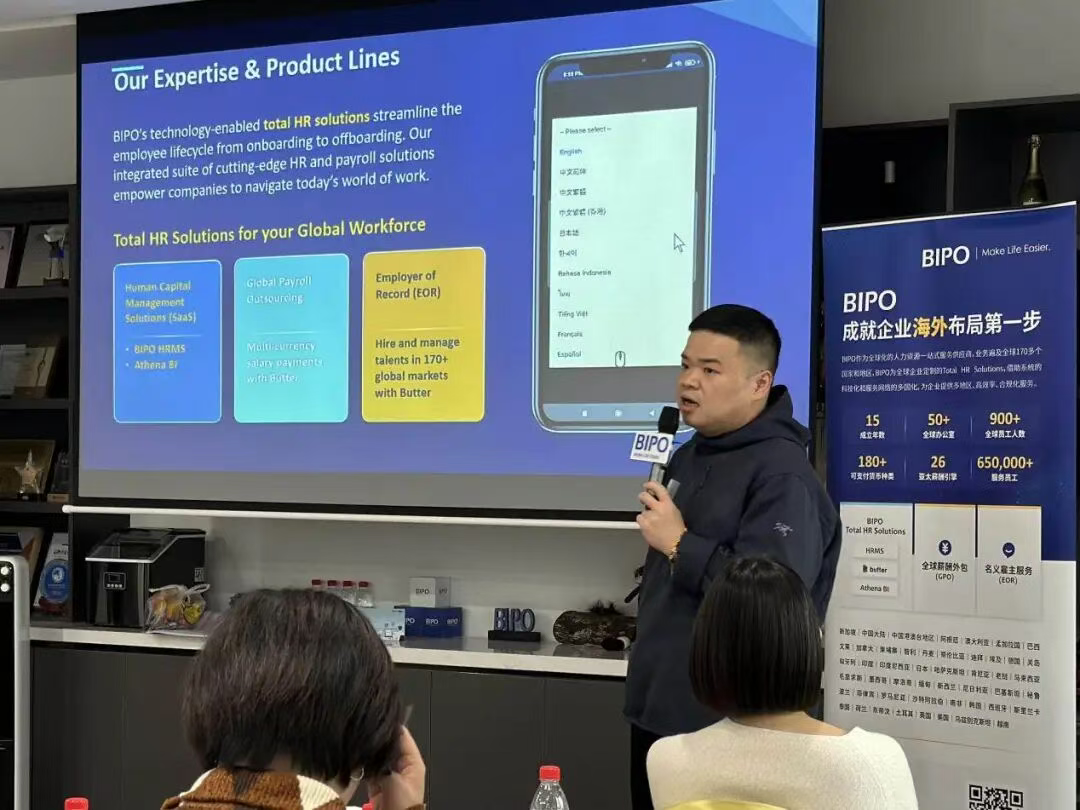 在主题分享环节,BIPO高级业务总监Ronnie Yu现场分享了《携手 BIPO,解锁亚洲薪酬管理的合规与效率之道》。他结合出海企业在亚洲多国运营中面临的实际场景,系统分析了跨国薪酬管理中的合规要点、成本平衡与运营效率问题, BIPO通过数字化平台、名义雇主(EOR)服务、全球薪酬外包服务(GPO)及本地化支持,助力企业实现稳健落地与高效运营的实践经验。